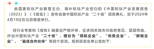 由國(guó)家釩鈦產(chǎn)業(yè)聯(lián)盟主辦、填補(bǔ)釩鈦產(chǎn)業(yè)空白的《中國(guó)釩鈦產(chǎn)業(yè)發(fā)展報(bào)告(2023)》(《報(bào)告》)發(fā)布會(huì)暨中國(guó)釩鈦產(chǎn)業(yè)“二十佳”頒獎(jiǎng)典禮,定于2024年4月19日在北京隆重舉行。