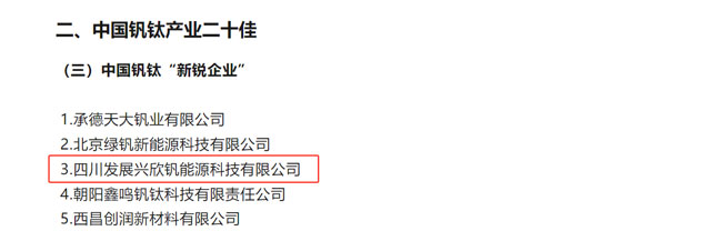 經(jīng)行業(yè)專家和《報(bào)告》編委會(huì)嚴(yán)格評(píng)審,征求相關(guān)地市州政府意見(jiàn),層層篩選評(píng)出中國(guó)釩鈦產(chǎn)業(yè)“二十佳”,細(xì)分為“領(lǐng)航企業(yè)”、“優(yōu)勢(shì)企業(yè)”、“新銳企業(yè)”、“最佳合作伙伴”等四個(gè)獎(jiǎng)項(xiàng)。公司控股子公司四川發(fā)展興欣釩能源科技有限公司(以下簡(jiǎn)稱“川發(fā)興能”)榮獲中國(guó)釩鈦產(chǎn)業(yè)“二十佳”“新銳企業(yè)”。
